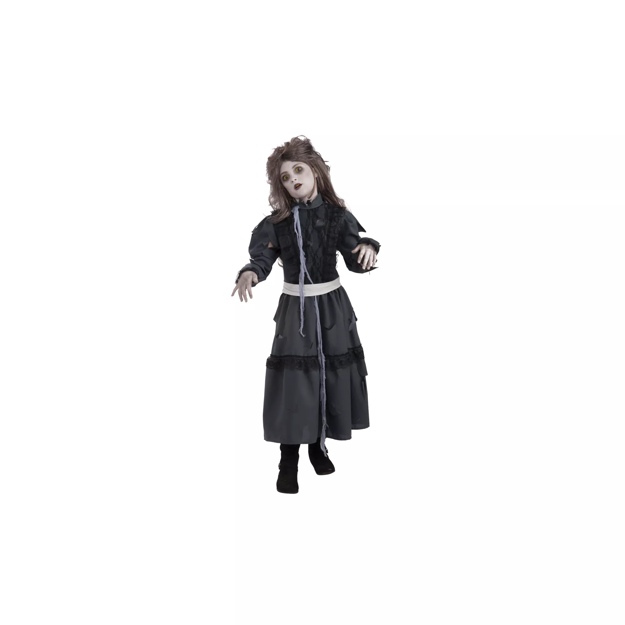 Look as if you've been roaming the world for centuries in this Victorian-era Zombie Girl child costume. The vintage-style dress comes complete with tattered bow and belt, so even though you're a zombie, you'll look cute in the process.