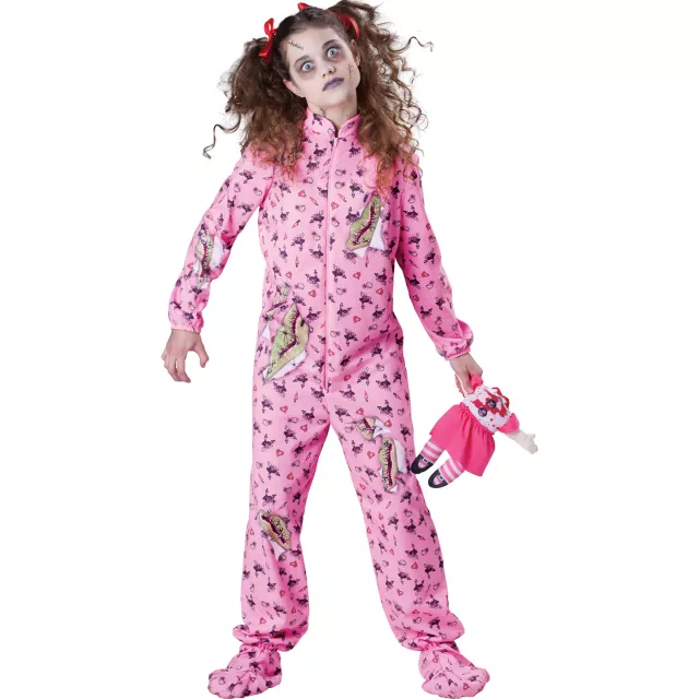 Grow up zombie-style in this killer cute pink, red and white Zombie Pajama Girl child costume. The 100% polyester footie jumpsuit comes with a headless doll toy to complete this eerie undead look.